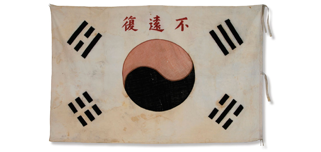 Taegeukgi with Chinese Characters Meaning “Liberation is Not Tar off