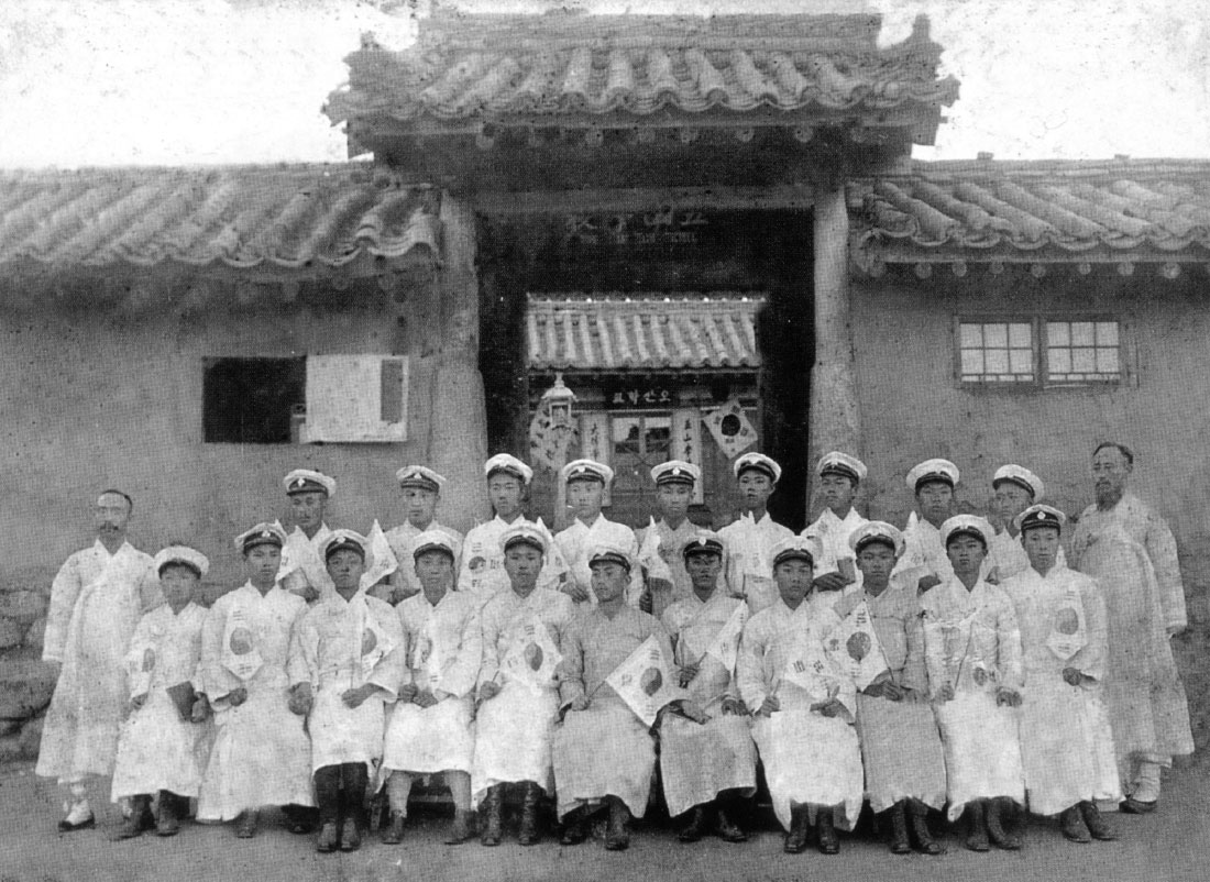 Osan School was founded in 1907 in Jeongju, Pyeonganbuk-do Province(presently in North Korea) by Lee Seung-hun(1864~1930). Students at Osan School developed skills and gained national consciousness. Though the photo was taken after Imperial Japan officially annexed the nation, the students pictured are holding the Taegeukgi in their hands, the symbol of Korea. The flags are also flown at the school.