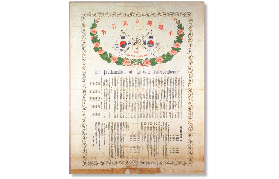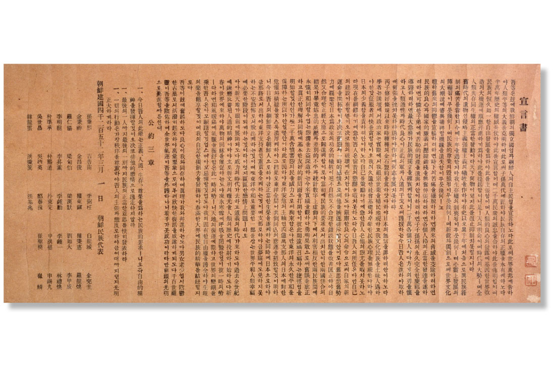 This is a written declaration of Korea’s independence in the name of 33 national representatives distributed on the day of the March First Movement in 1919. It consists of text explaining the legitimacy of independence, three pledges of action, and the names of 33 representatives. On February 27, just before the planned protest, 21,000 copies were printed. The typo, in which the nation's name, 朝鮮(Joseon) was written backward 鮮朝 on the first line, tells us of the urgency of the situation in the midst of constant Japanese surveillance to prevent any such anti-Japanese activity.